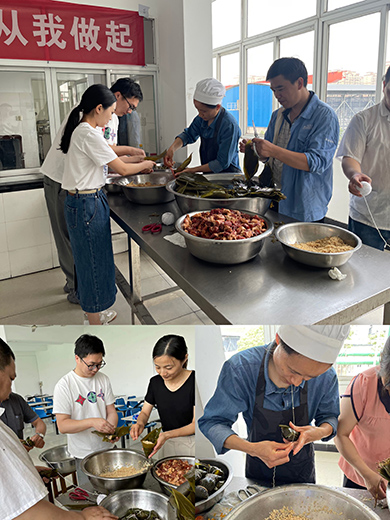 浓浓的粽叶香气四溢、沁人心脾。为了组织好这次活动,食堂工作人员早已精心准备好活动所需要的各种材料,包括浸泡好的糯米、清香的粽叶、蛋黄、猪肉等材料。活动正式开始,大家撸起袖子开始包粽子,大部分同事是第一次包,大家通过观看网上视频教学,并由经验丰富的同事现场指导,“卷粽叶要这么卷才能不漏米,你看这个绳子要这样扎”,大家互帮互学很快上手。在大家的不懈努力下,一个个造型多样的粽子摆满餐桌,满满两大盆的粽子,承载着大家满满的幸福。之后将包好的粽子煮好出锅,分送给员工们。