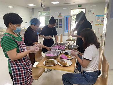 清风明月,圆圆的月饼承载着中国传统文化的精神和阖家团圆的浓浓情意。9月9日上午,公司精心组织了“同享中秋情,共度团圆节”手工做月饼活动。活动现场,餐桌上整齐摆放着冰皮粉、奶黄、红豆、芋泥、紫薯馅料以及模具。大厨现场教学,详细讲解和指导冰皮月饼的制作方法。大家边摸索学习边实践制作,从开始的手忙脚乱,到慢慢地掌握制作要领,和面团、擀面皮儿、包馅料、压模具,当一个个以“爱”为馅的月饼从自己手中诞生时,大家都异常兴奋和满足,圆圆的月饼吃的是文化,传递的是祝福。