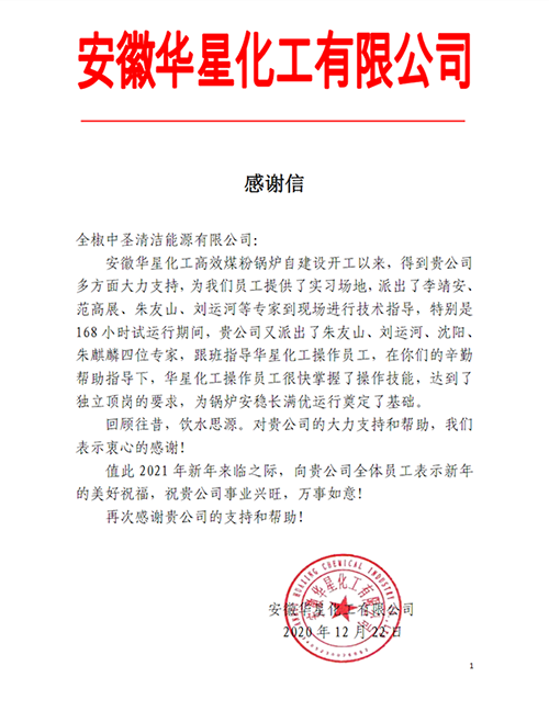 12月22日,安徽华星化工的感谢信翩然而至全椒千亿球友会清洁能源有限公司。