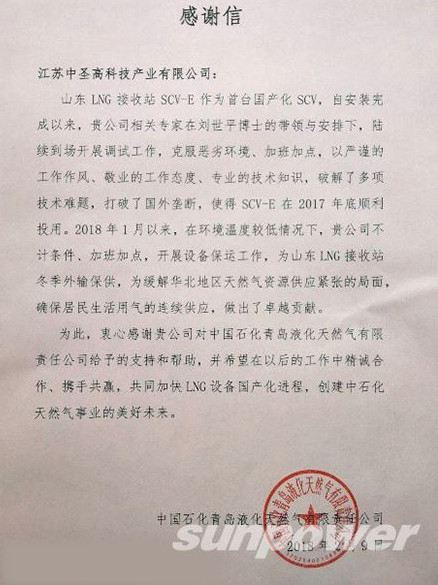 中石化青岛LNG接收站首台国产SCV,是在中石化集团科技部、物装部、天然气分公司、青岛LNG接收站领导和技术人员直接领导下,由千亿球友会集团研发、设计、制造人员共同研制成功,自2017年底投用以来为青岛LNG接受站冬季外输保供,缓解华北地区天然气供应紧张的局面,确保居民生活用气的连续供应,特别是2018年春节期间出色完成保运任务,受到业主表扬。