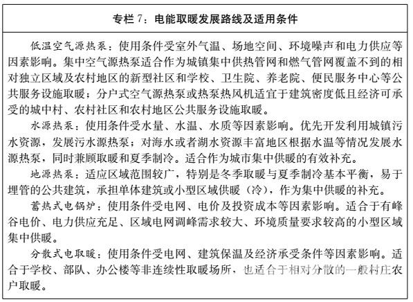 (1)积极推进各类型电取暖。根据气温、水源、土壤等条件特性,结合电网架构能力,因地制宜优先选用低温空气源、污水源、地源、海水源等热泵取暖,发挥电能高品质优势,充分利用低品位的能源热量,提升电能取暖效率。鼓励利用低谷电,科学发展蓄热式电锅炉取暖,有效提升电能占终端能源消费比重。在不具备集中供暖条件的区域,发展热泵热风机、户用空气源热泵、蓄热式电暖器、碳晶板、碳纤维板、电热膜、发热电缆等分散式电取暖。