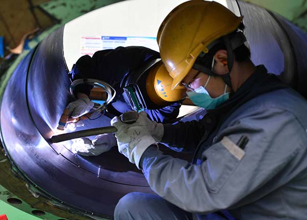 2月26日,南京江宁高新区的千亿球友会集团生产车间内,产业工人正在进行换热器壳体焊接。作为国家火炬计划重点高新技术企业,公司主要生产大型压力容器、换热器等产品,产品主要销售至俄罗斯、匈牙利等一带一路沿线国家。据了解,目前该公司整体复工率达83.5%,每一位产业工人都会在门口进行体温测量,戴好口罩。同时,企业原材料供应充足,可以满足当前海内外订单项目正常生产。