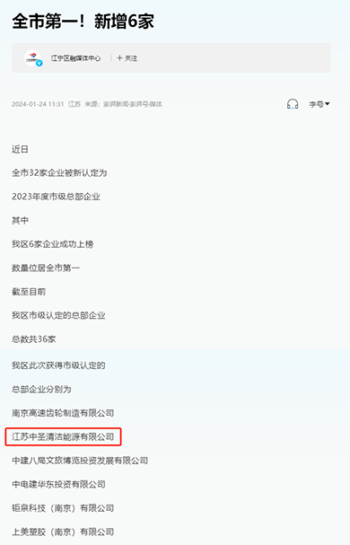 近日,根据《关于印发〈南京市总部经济发展三年行动计划(2022—2024年)〉的通知》(宁总部﹝2022﹞1号)精神,经南京市促进总部经济发展联席会议办公室正式发文通知,江苏千亿球友会清洁能源有限公司被认定为南京市2023年度市级总部企业(区域型)。这一荣誉,江宁区融媒体中心、新浪财经发文进行了相关报道。