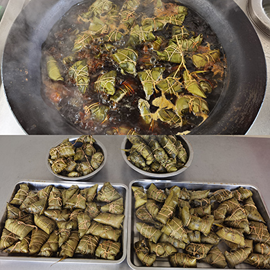 浓浓的粽叶香气四溢、沁人心脾。为了组织好这次活动,食堂工作人员早已精心准备好活动所需要的各种材料,包括浸泡好的糯米、清香的粽叶、蛋黄、猪肉等材料。活动正式开始,大家撸起袖子开始包粽子,大部分同事是第一次包,大家通过观看网上视频教学,并由经验丰富的同事现场指导,“卷粽叶要这么卷才能不漏米,你看这个绳子要这样扎”,大家互帮互学很快上手。在大家的不懈努力下,一个个造型多样的粽子摆满餐桌,满满两大盆的粽子,承载着大家满满的幸福。之后将包好的粽子煮好出锅,分送给员工们。
