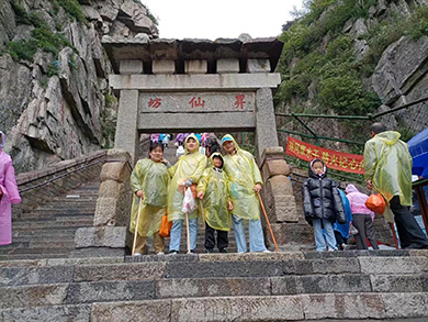晨游泰山,云雾窈窕!五月上泰山,石屏玉道开!时为孟夏,漫山滴翠,细雨蒙蒙,大家穿好雨衣,带上战“拐”!乘车来到中天门,开始攀登大家蜂拥而至、纷纷呐喊“青春没有售价,泰山就在脚下”!刚开始,路还比较平坦,从十八盘开始,就是传说中的紧18慢18,不紧不慢又18!要去爬泰山,就去十八盘,说险他就险,说难也不难!大家咬紧牙关往上攀,一步一景一层天!途间,回首众山小,举头望天门!经过一个多小时的停停歇歇,大家终于到达了南天门,飘渺中,能见天街小雨润如酥,雾气迷离间,始觉多少寺庙烟雨中!在南天门,大家似乎忘却了腿软脚疼,尽情欣赏,一起合影留恋!