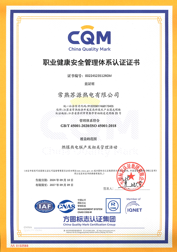 苏源热电-职业健康安全管理体系认证证书