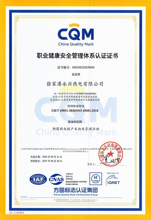 永兴热电-职业健康安全管理体系认证证书