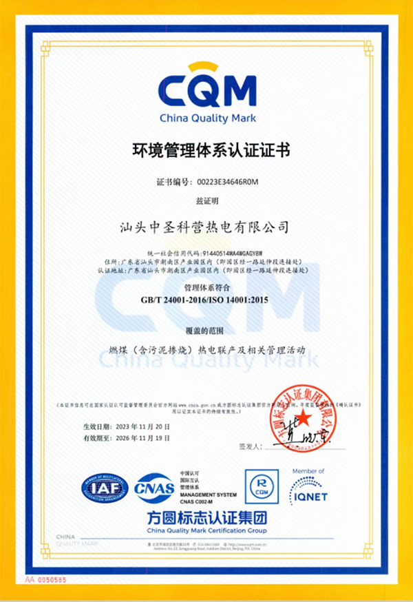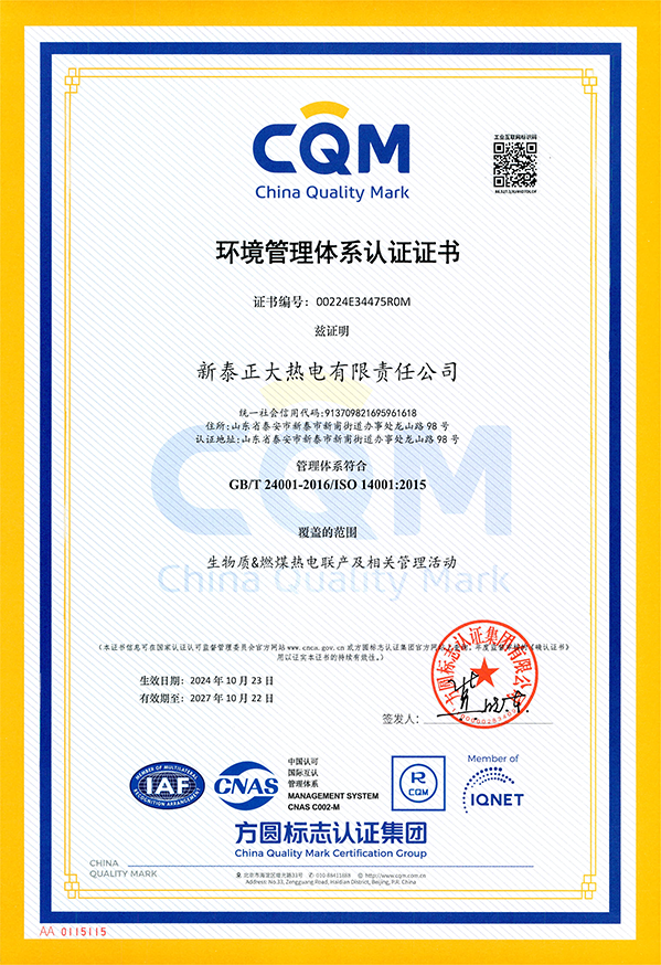 正大热电-环境管理体系认证证书