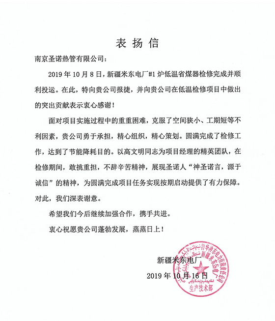 台上一分钟,台下十年功!10月16日,圣诺热管收到新疆米东电厂发来的表扬信,信中高度肯定了以高文明为项目经理的圣诺团队,在米东电厂1#炉低温省煤器检修工作中所做出的突出贡献。这是继今年10月圣诺获得大唐长春第三热电厂发来的表扬信之后,圣诺团队再次获得业主方的肯定。