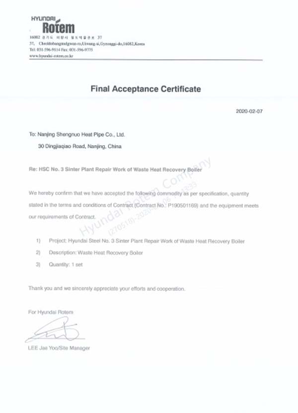 项目来之不易,在验收这个特殊的阶段,不能因为疫情而袖手旁观!国际贸易部的伙伴们利用每一个疫情放缓的间隙,主动、认真地与韩国合作伙伴讨论对策,积极配合总包方解决运行中的异常状况,协助诊断异常发生的原因,最大程度满足业主方提出的要求。在设备系统经过5个月的运行调试后,业主方现代制铁和总包方Rotem一致认为圣诺的设计和供货已满足三方协议中的各项要求,同意最终验收。7月6日,我们收到了业主方发来的项目最终验收证书,这是对圣诺公司的技术水平和制造水平的再次见证,我们有信心和能力做得更好!