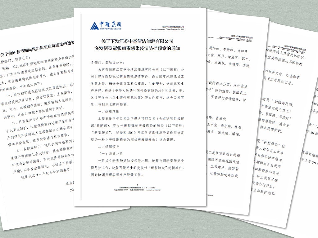 自新型冠状病毒感染的肺炎疫情发生以来,清洁能源本部及项目公司疫情防控小组一直处在疫情防控的一线,确保“把疫情挡在门外、把健康留在厂内”。在集团公司的统一部署下,清洁能源公司于1月27日提前召开了春节防疫工作及近期工作调度会议,成立防疫办公室并下发了《江苏千亿球友会清洁能源有限公司突发新型冠状病毒感染疫情防控预案》,各项目公司也随之成立防控领导小组并印发各自的疫情防控预案。