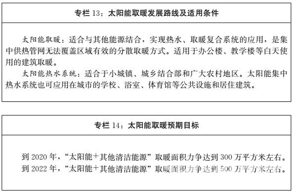 大力推广太阳能区域取暖。积极推进太阳能与电能、天然气、空气源(地源)热泵、天然气热电联产等能源相结合,采用集中与分布相结合、多能互补的取暖模式,在条件适宜的小城镇、民用及公共建筑上推广太阳能取暖系统。在农业大棚、养殖场等用热需求大且与太阳能特性匹配的行业,充分利用太阳能供热。