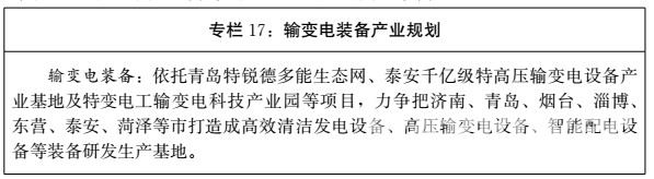 2.输变电装备。以山东电工电气、泰开集团、特变电工、山东达驰等企业为主体,抓住国家鼓励发展超高压、特高压、智能电网和煤改电等重大机遇,加快特高压及超高压输变电设备、智能变电站成套装备、智能配电网成套设备、用户端智能化成套装备和能源互联网核心装备等相关产业发展,建设全国高端智能输变电装备生产基地。进一步支持中小型企业技术创新,在强弱电控制设备、自动控制装置等低压电器设备领域取得技术突破,加大在线检测、智能分析等技术在设备制造中的应用。引进一批行业领先的智能电网企业,深化与本省企业合作,在数字化变电站、智能配电网设备、电网智能调控等智能输变电领域实现技术创新,提升我省电力装备企业的整体竞争力。