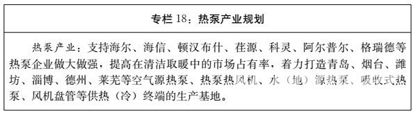 3.热泵产业。稳步发展浅层土壤源、海水源热泵,大力发展低温空气源热泵、热泵热风机,积极发展污水源热泵、吸收式热泵,进一步提升热泵产业层次和规模,形成从主机制造、零部件制造、关键设备配套、技术服务等完整产业链,打造青岛、烟台、潍坊、淄博、德州、莱芜等热泵产业集群,进一步巩固我省在全国热泵强省产业地位。以“中国制造2025”“互联网+工业”为依托,借鉴青岛海尔等清洁能源智联工厂建设新模式,积极推动“互联网+智慧工厂”“互联网+智能制造”建设,促进热泵产业智慧化生产。