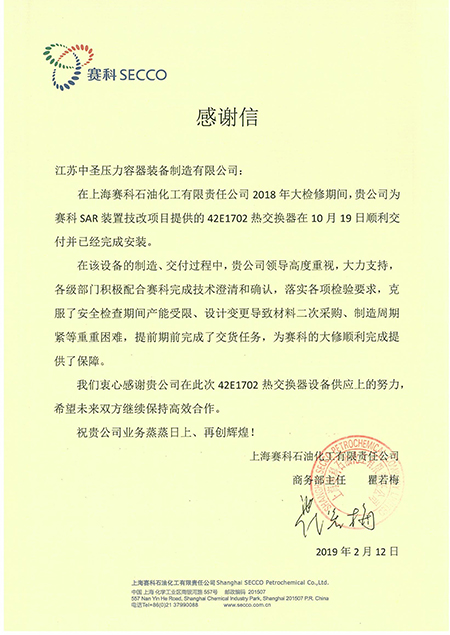 瞿主任表示,42E1702热交换器是上海赛科废硫酸回收利用技改项目中的重要设备,对整个装置的环保运行有着重要的影响,是上海赛科高度关注的一台设备。在该设备制造过程中,千亿球友会公司各级领导高度重视,各部门积极配合,克服了设备结构复杂、制造难度高等多重困难,圆满完成并提前交付,为上海赛科的大修顺利完成提供了保障。赛科对千亿球友会在此次设备供应上的努力表示衷心感谢,并希望双方继续保持深入高效的合作。