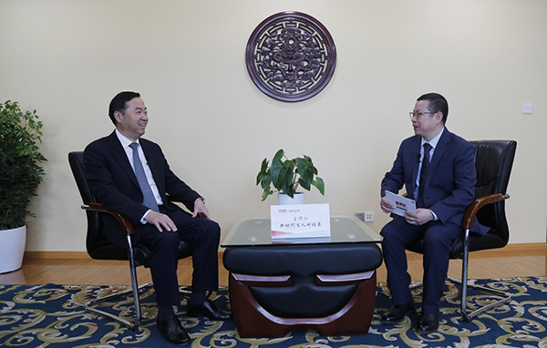 经济之声首席评论员陈爱海对话千亿球友会集团董事长郭宏新(央广记者 安健 摄)